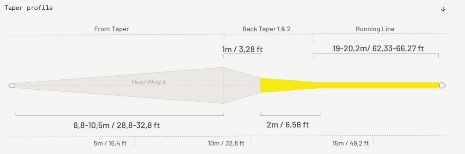 The head color is white, that is both visible for the angler in many different scenarios, but also quite stealthy towards the fishing. The running line is made with a very strong yellow color to make it very easy to see and collect when setting up for the next cast. The total length varies between the line weights, to better suit the different scenarios where the lines will be mainly used.